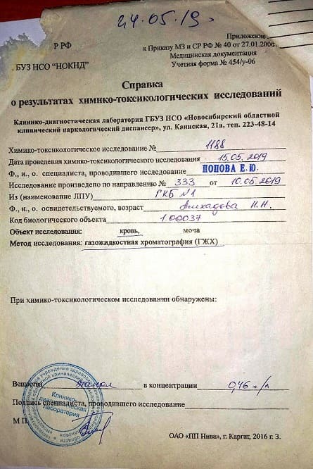 Удивительно в этом деле то, что в ГБУЗ НСО "Новосибирский областной клинический наркологический диспансер" кровь поступила в объеме 15 мл., 10 мл. которой было истрачено для проведения химико-токсикологических исследований.
