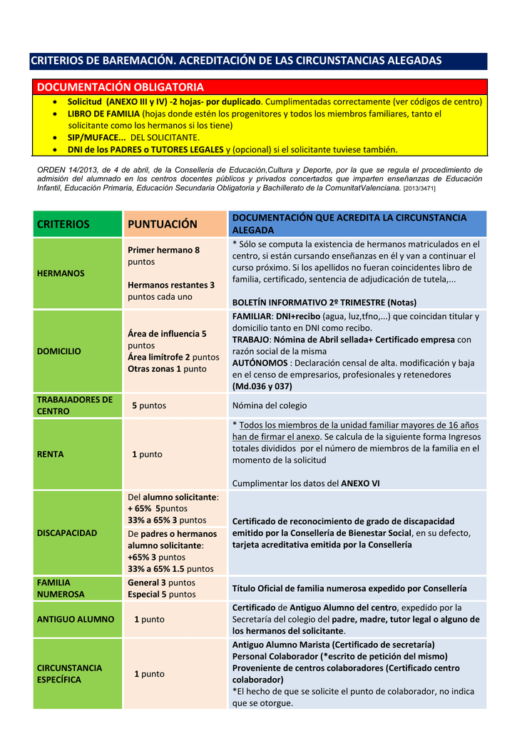 Распределением мест в публичные и получастные школы занимаются департаменты образования по месту регистрации. Каждое заявление оценивается по специальной шкале CRITERIOS DE BAREMACION и предпочтение отдается тому, которое набирает наибольшее количество баллов. Баллы начисляются за наличие причин обучения именно в этой школе. К примеру, 10 баллов дается за проживание в районе школы или наличия рядом работы родителей - área influencia. Если в выбранной школе уже учатся старшие братья и сестры, заявитель получает еще плюс 15 баллов и дальше в том же духе.
