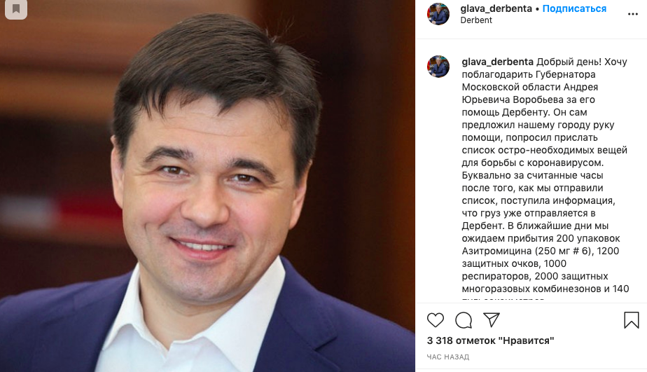«Хочу поблагодарить губернатора Московской области Андрея Юрьевича Воробьева за его помощь Дербенту. Он сам предложил нашему городу руку помощи, попросил прислать список остро необходимых вещей для борьбы с коронавирусом», — говорится на официальной странице главы Дербента.
