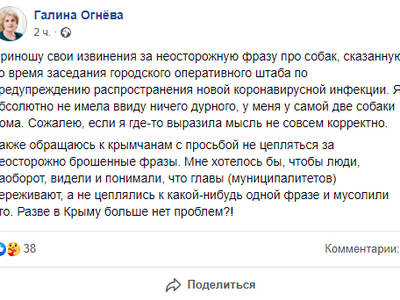 ГалинаОгнева на своей странице в Facebook**** уже опубликовала пост, в котором попросила извинения за "неосторожную фразу" про собак. По ее словам, она не имела в виду ничего дурного, поскольку у нее самой два питомца дома.