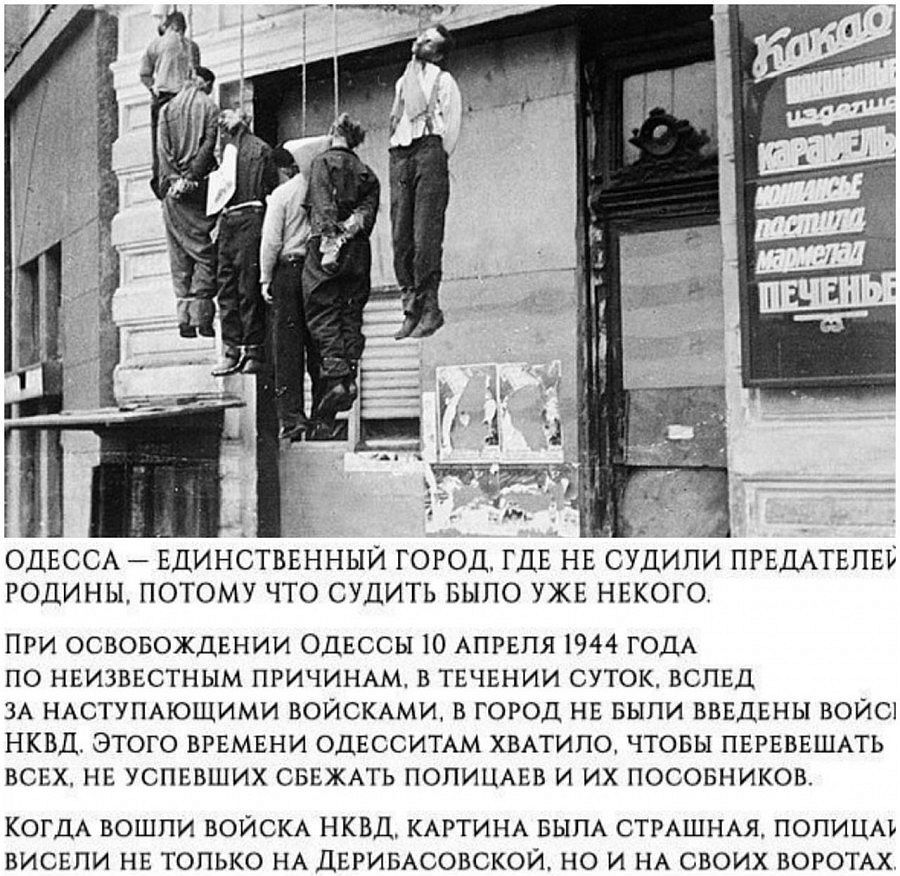 При освобождении Одессы 10 апреля 1944 года по неизвестным причинам, в течении суток, вслед за наступающими войсками в город не были введены войск НКВД. Этого времени одесситам хватило, чтобы перевешать всех, не успевших сбежать полицаев и их пособников. Когда вошли войска НКВД, картина была страшная. Полицаи висели не только на Дерибасовской, но и на своих воротах."