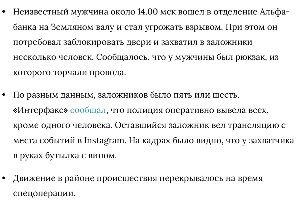Сегодня, 23 мая 2020 года, около 14.00 по московскому времени стало известно, что в московское отделение полиции поступило сообщение о захвате заложников в отделении Альфа-банка в самом центре Москвы. Мужчина, который одет в форму курьера, вошел в помещение Альфа-банка как обычный посетитель... Затем он начал угрожать взрывом и потребовал от сотрудников банка заблокировать все двери. Спустя час, около 15.00, захватчик уже был задержан. Никто из посетителей и сотрудников банка не пострадал.