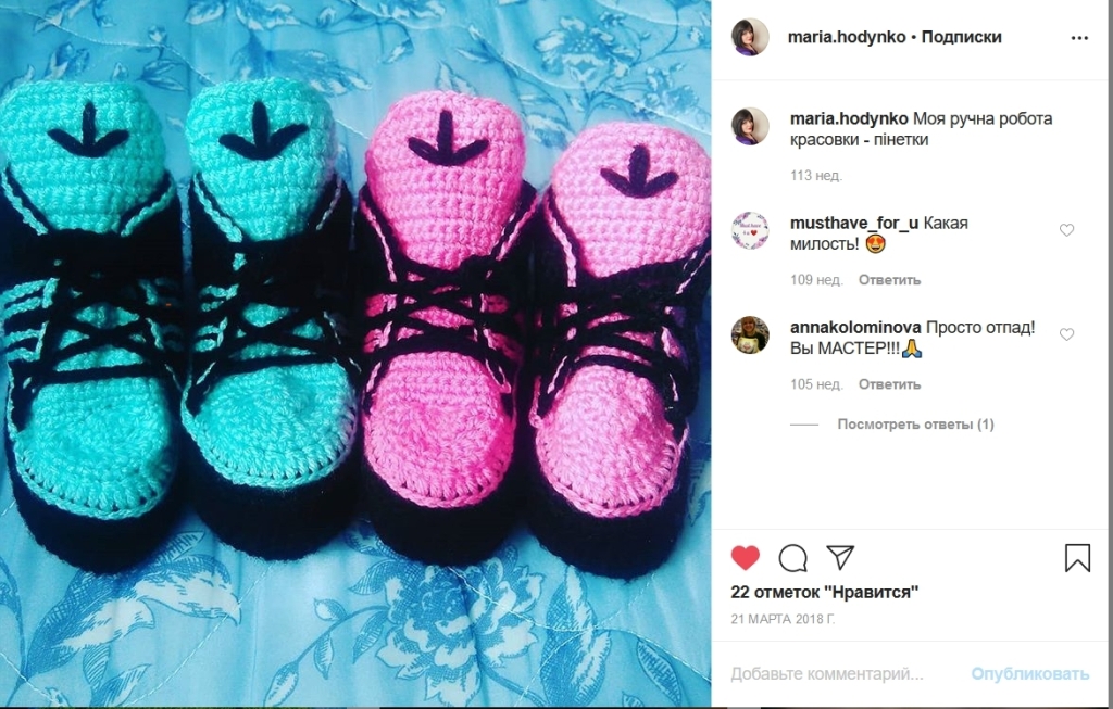 Ничего нового! Америку открываете для себя. Такие "кроссовочки" и др. вязалки уже давно по инету ходят. Те, кто в теме, это знают. Только очень трудно продать все эти "Хэнд мейды",т.к. редкие покупатели у нас могут заплатить хорошо за ручное творчество! На поток это не поставишь... И заработки получаются крохотные.