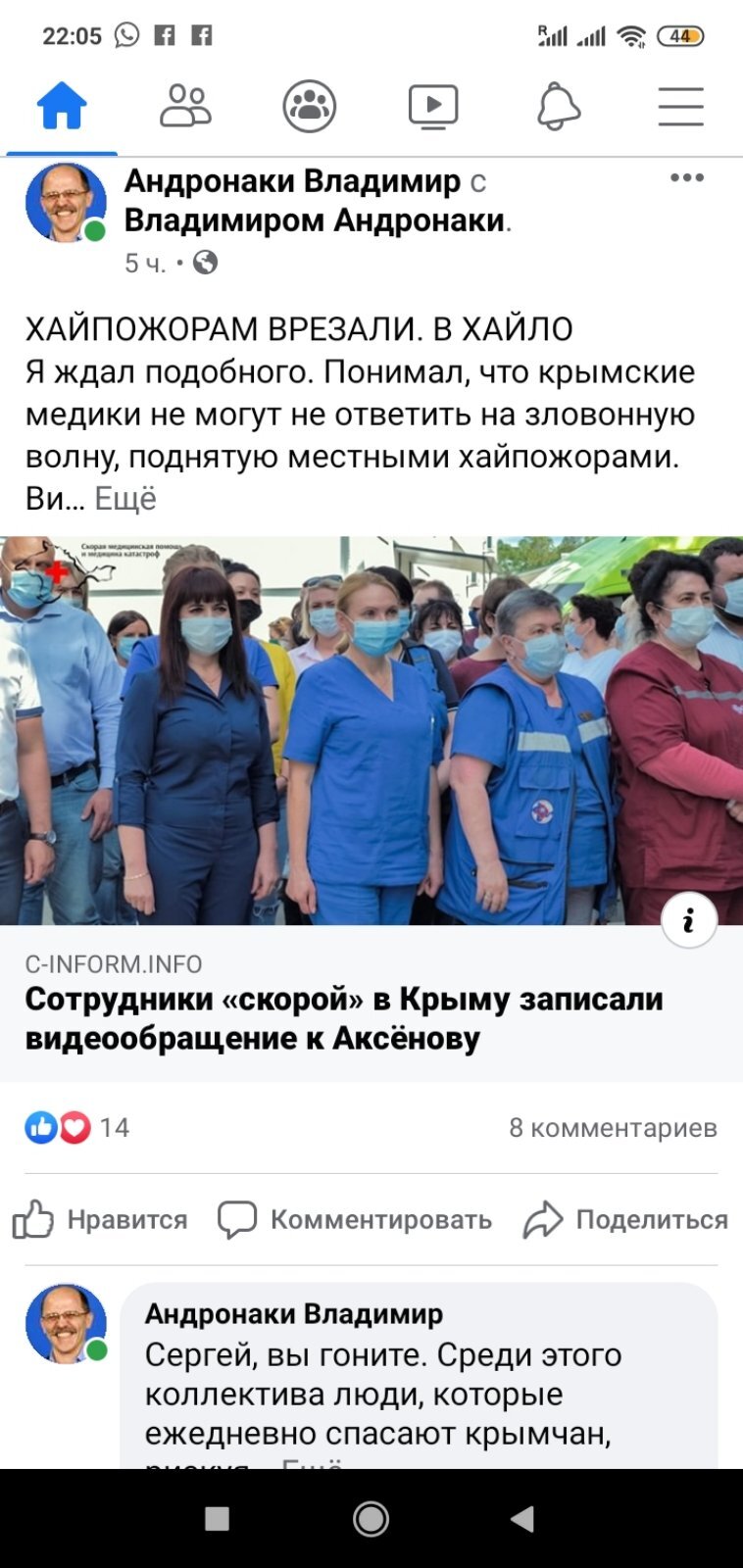 Напомним, всё началось с видеообращения сотрудников станции скорой помощи Керчи. Они пожаловались премьеру Мишустину на то, что не получили обещанные надбавки за работу с пациентами с коронавирусной инфекцией. В ответ на обращение, опубликованное в начале мая в соцсетях, Сергей Аксёнов разразился гневом в адрес врачей. Он назвал недовольных врачей, фельдшеров и медсестёр «провокаторами, циркачами и шантажистами».