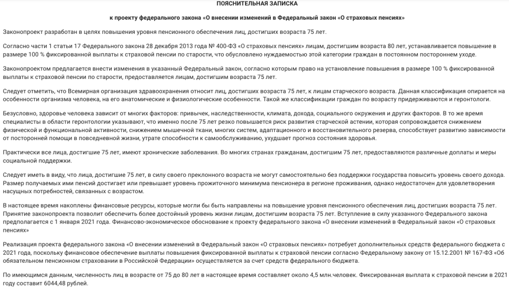 В пояснительной записки также отмечается, что в настоящее время уже накоплены финансовые ресурсы, которые могут быть направлены на повышение уровня пенсионного обеспечения лиц, достигших 75-летия.