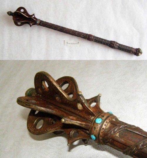 Ударная часть закреплялась на железном древке с помощью фигурной гайки, либо расклепыванием верхнего окончания древка.