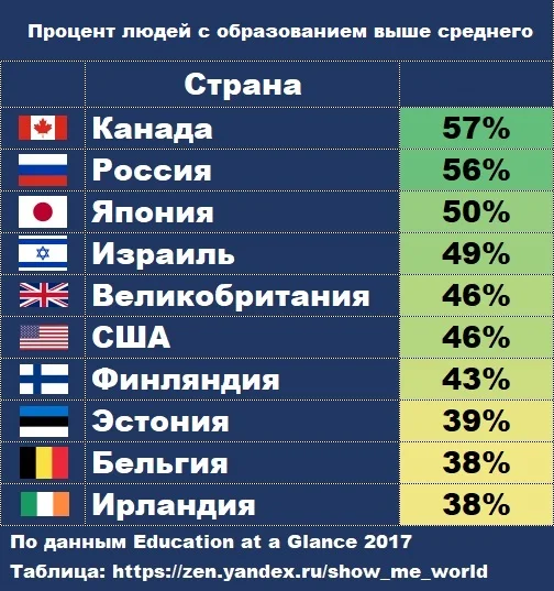 Россия на сегодняшний день находится в лидерской тройке по количеству людей, которые получили как и высшее образование, так и среднее профессиональное. Сравним нашу страну и другие страны по количеству людей в возрасте от 25 до 64 лет с высшим и средним профессиональным образованием.
