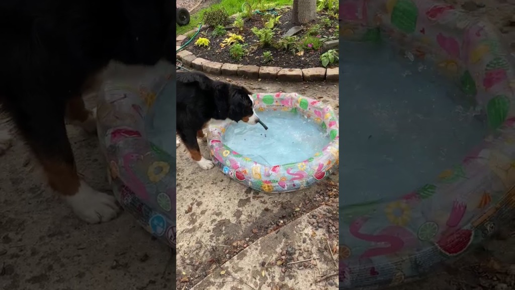 Occurred on May 24, 2020 / USA "Four-month-old golden retriever puppy, Daphne, enjoying her new pool while two-year-old Bernese Mountain Dog, Charlie, just w...