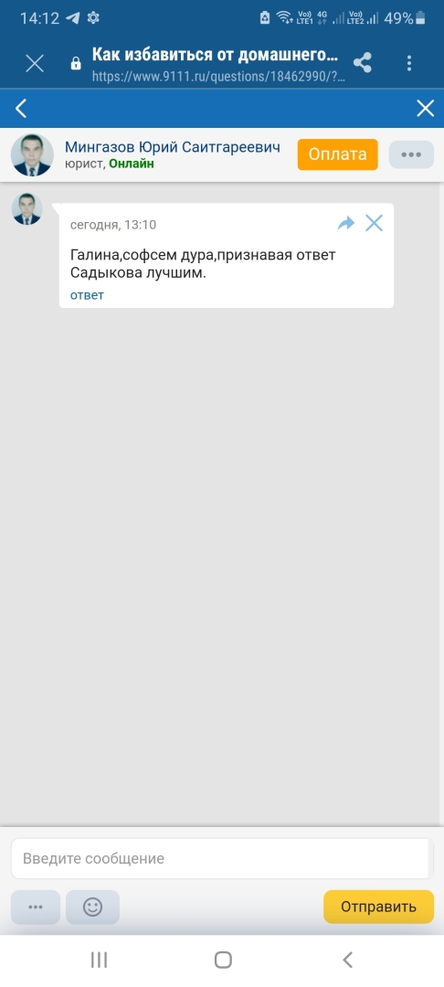 Мингазов Юрий Саитгареевич человек явно с психическими проблемами и неадекватный. Стремится отвечать на вопросы посетителей сайта, явно не по теме, невпопад, сильно обижается если его ответ не выбирают, после чего заходит в личку и оскорбляет, скрин прилагаю.
