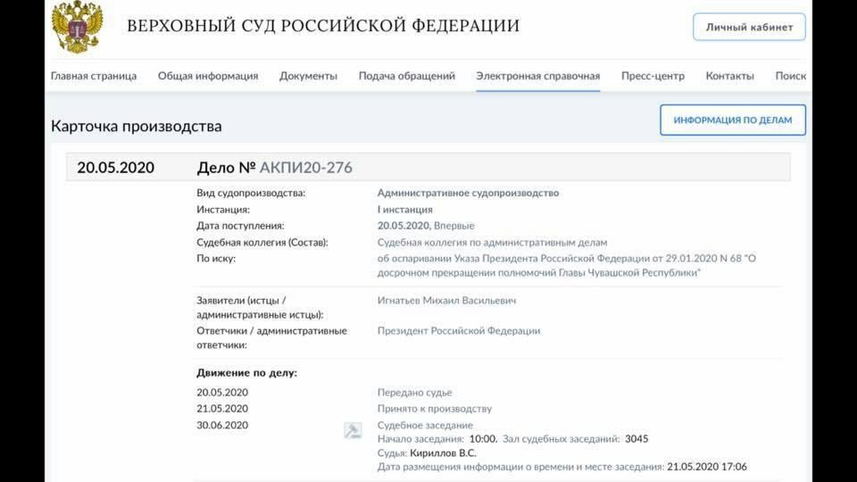 Как следует из информации в картотеке дел на официальном сайте Верховного суда РФ экс-глава Чувашии Михаил Игнатьев подал административное исковое заявление, в котором он оспаривает Указ Президента Российской Федерации от 29.01.2020 N 68 «О досрочном прекращении полномочий Главы Чувашской Республики», т.е. о своем отрешении от должности. Соответственно административным ответчиком по данному делу выступает глава государства Владимир Путин. Административный иск Игнатьева зарегистрирован в Верховном суде РФ 20 мая, а его рассмотрение намечено на 30 июня текущего года.