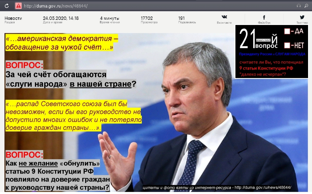 24.05.2020 г. Председатель Государственной Думы заявил, что США за счет вброса дезинформации по ситуации с коронавирусом, а также по рейтингам власти в России пытаются дестабилизировать ситуацию в Российской Федерации с целью сохранения своего доминирующего положения в мире.