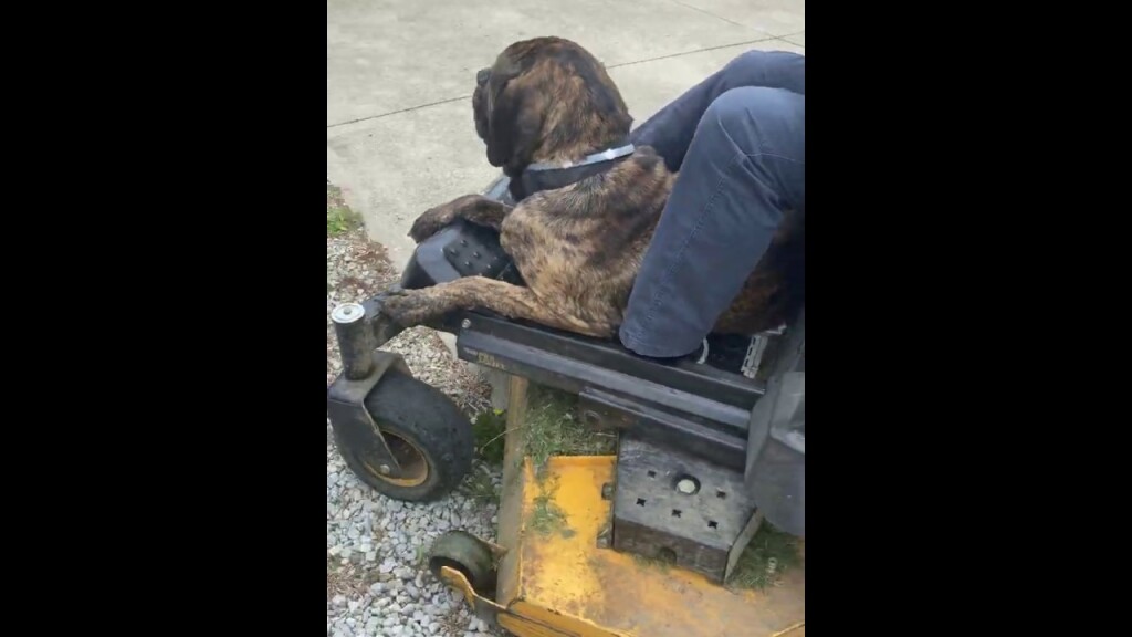 Occurred on May 8, 2020 / Camden, Ohio, USA "My dog Bentley, who is a bullmastiff, loves to ride with me on the mower." Contact licensing@viralhog.com to lic...
