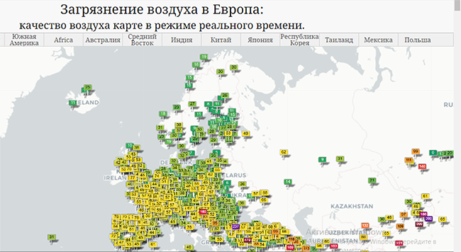 Оценим состояние воздуха в тех странах, которые охватила пандемия коронавируса. Воздух-это один из главных показателей, позволяющих судить о состоянии окружающей среды. Всякий желающий, без особого труда, может отыскать в сети интерактивную карту, демонстрирующую загрязнение воздуха в той или иной стране мира в режиме реального мира (https://aqicn.org/map). На карте разные уровни загрязнения воздуха отмечены разноцветными флажками.