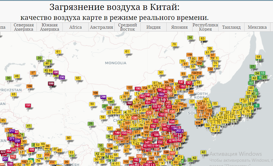 Прежде всего, обратим внимание на Китай, который стал первоисточником распространения коронавирусной инфекции. Обилие красных и даже фиолетовых флажков на территории Китая, показывает нам, что состояние атмосферы в Китае является критическим. Зелёные флажки на территории Китая встречаются крайне редко. Это те маленькие островки суши, где воздух относительно чист и им можно дышать.