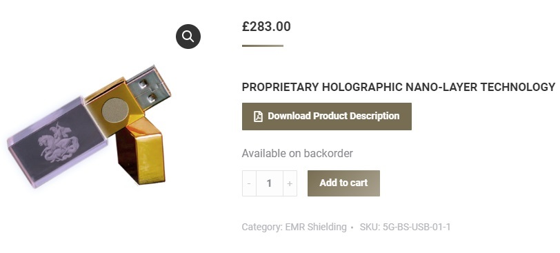 Британская компания 5G BioShield торгует USB-устройством, которое является защитой от сигналов 5G. По уверению компании, они используют новейшие технологии, которые защищают здоровье людей от излучения. Принцип работы основан на квантовом голографическом катализаторе.