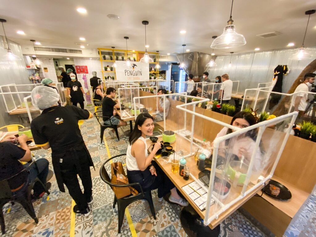 После того, как дошли слухи о том, что рестораны могут открыться при условии соблюдения социальных дистанций, сеть ресторанов Penguin Eat Shabu в понедельник вновь открыла свои филиалы Ari и Ratchapruek с временными барьерами, укрывавшими каждый столик для двух человек.