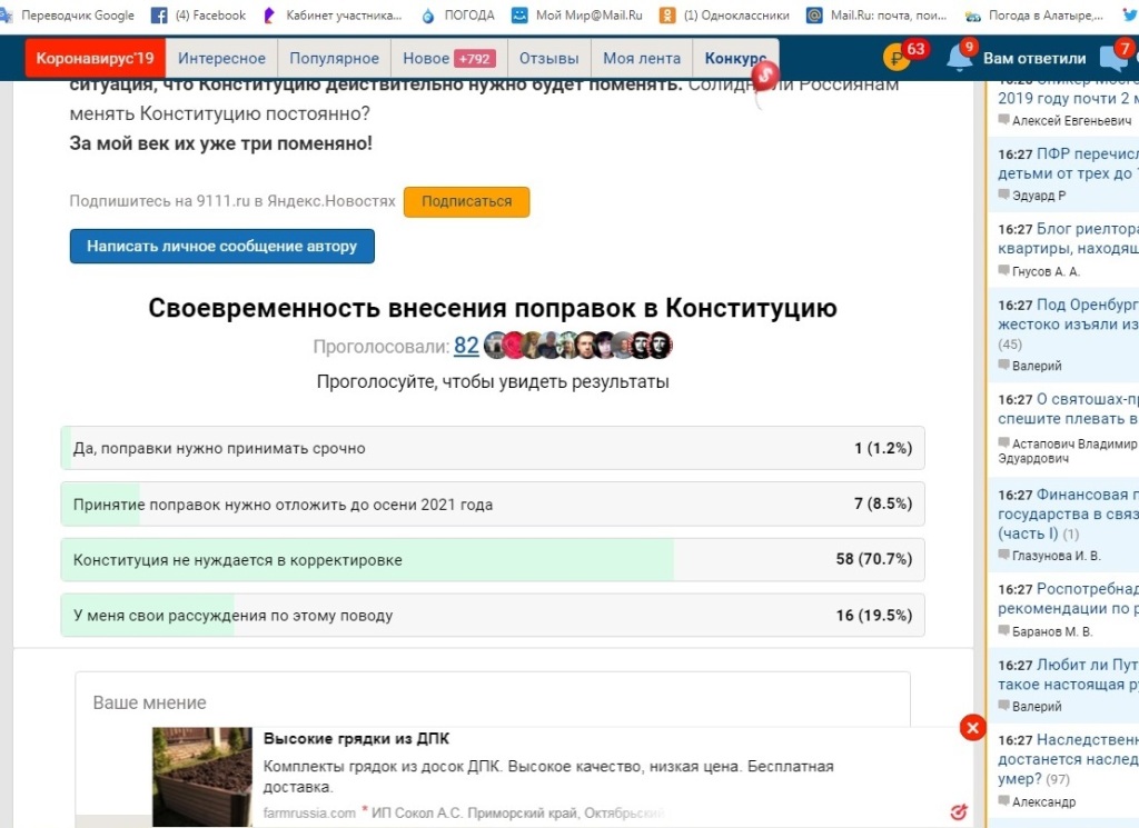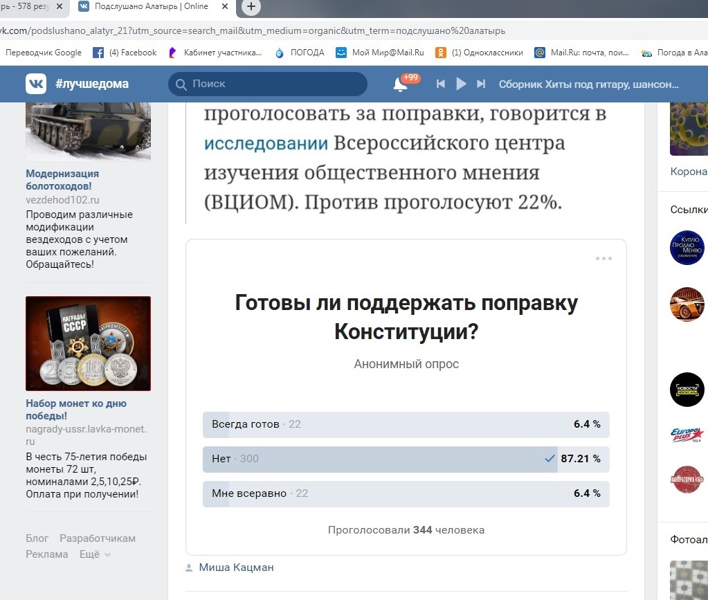 Вы чего такая сердитая?! Думаете, если поправки не примут, то еще хуже будет?.. А разве сейчас "хуже"?! ...Хуже, чем когда? ... Я лично ни за ни против. Я при любых Главковерхах нормально жил; начиная с Хрущева. И при разных (уже) 3-х Конституциях. А эти фотки не с одного этого сайта, вторая фотка с другого, но результат сравнительно одинаковый. Хотелось бы посмотреть с разных сайтов, где за поправки большинство; Я, УВЫ, такого не встречал... Разве СОЛИДНО менять Конституцию по нескольку раз за всего ОДНУ человеческую жизнь? А в оскарблялки и в дразнилки, даже в обзывалки Я с детского садика не играюсь.