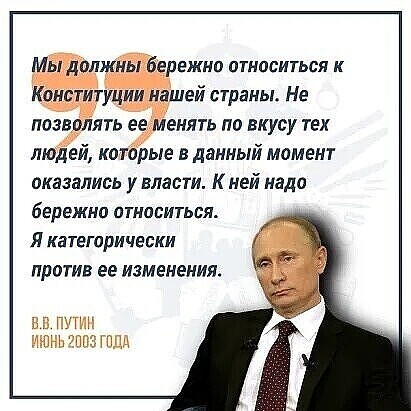 Да потому что мы колония! А в колониальной стране колониальную конституцию пишет выигравшая страна! Не боломудьте людей, это боком всем выйдет, почитайте конституцию там все написано, пока не почитала как вы рассуждала! Вы зациклились на том что именно он будит рулить а то что им рулят с нашей помощью 30 лет ничего? Ничего что мы знатьне хотели что подписывали в 93 году!, раете глотку засланные казачки, вы против путина я за, потомв что люблю свою страну, потому что до меня дошло что недавно думала иначе, потому что поняла что россию сдплали кодониейдо путина!, и если до вас не дойдет то бвдет поздно, читаешь и диву даешься сколько желчи ненависти и злости, вы где видрли колонию чтобы с рабами обращались хорошо?, я не видела. И потому за поправки, путину досталось то что досталоськонституция написанная американцами, и утвердили ее мы! Тупоголовые, к счастью мы и вернуть ее можем хоть и написана она америкой, приняли то ее мы!, а путину вам объяснить нельзя по этой же аонституции, это воля народа, сидите и ждите когда вас как баранов передушат позакону колонии, вместо того чтобы почитать вы слепо обвиняете человека, задумайтесь почему его указания не исполняют? Да потому что нет статьи в законе, она специально не предусмотрена, могу скинутьн номера глав из закона, но лучше разберитесь сами прежде чем судить на ровном месте, сейчас он по закону не имеет права нас защищат! Тупиздней,