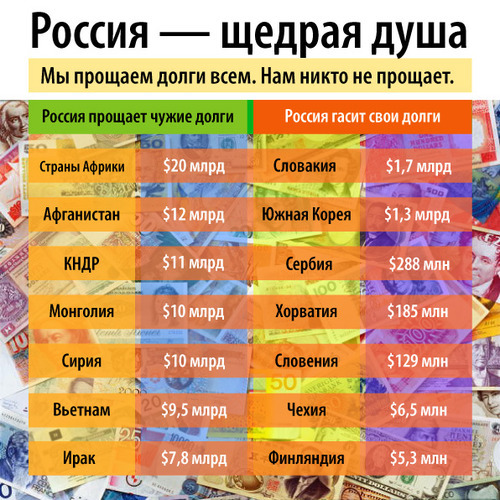 За 20 лет РФ списала долги Ираку, Афганистану, Монголии, Киргизии, Сирии, Алжиру, Кубе, Узбекистану, КНДР, Ливии, Эфиопии, Лаосу и даже Никарагуа.Более подробно можно почитать о списанных долгах здесь https://66.ru/news/world/215158/