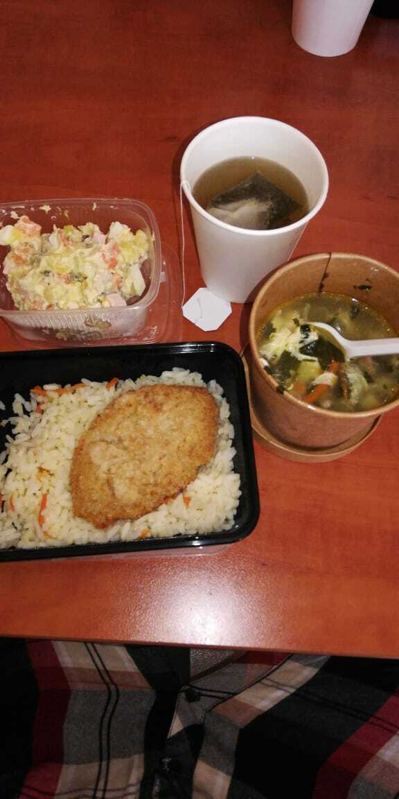 Кормят нормально. Да это не как на лайнере, который законсервировали около Японии, где подавали омаров и экзотические фрукты. Но пойдёт. К примеру на обед принесли суп с крапивой, мясом и яйцом, салат и рыбная котлета с рисом.