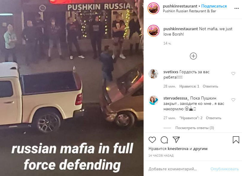 Айк Газарян отметил, что сегодня ресторан снова не откроется, потому что люди боятся беспорядков. Наши соседи напротив из высокоэтажного здания сфотографировали нас и выложили в соцсети наши фотографии с подписью, гласящей о том, что «русская мафия не дает поджечь свой ресторан».
