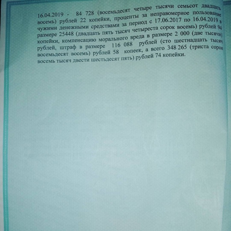 Однако, судом также удовлетворены требования заёмщика о взыскании с банка страховки на 120 000 рублей, процентов по ставке 24,9 % годовых на сумму 84 728 рублей 22 копейки, процентов за пользование чужими денежными средствами 25 448 рублей 94 копейки, морального вреда 2000 рублей, штрафа в размере 116 088 рублей. Всего взыскано 348 265 рублей 74 копейки.