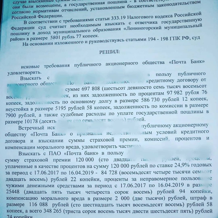 Суть дела: кредитор Почта Банк обратился в суд с требованием о взыскании с заёмщика долга на общую сумму 697 808 рублей. Судом взыскана с заёмщика сумма долга.