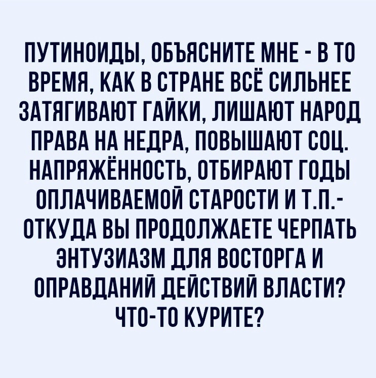 А не хрен народ подбивать на майдан как на Украине. Когда соберется толпа в 15-20 тысяч человек и в нее неизвестно откуда прилетят бутылочки сиропа Молотова, что будет с этой толпой? Будет как на Украине, стреляют и в наших, и в ваших, а потом результат как на Украине. И все что Путин строил с таким трудом, коту под хвост. При Путине много предприятий модернизировано, либо отстроено с нуля. Смотрите здесь https://vk.com/pozitivrus78