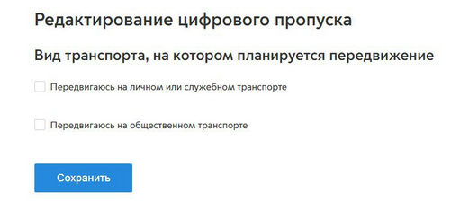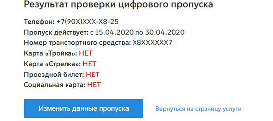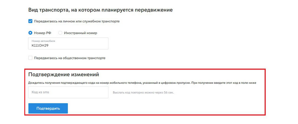После проверки действительности кода будет доступна кнопка "Изменить данные пропуска". В следующем окне нужно отметить, что вы планируете передвигаться на личном транспорте. Далее появится окно, где необходимо ввести или изменить номер автомобиля.