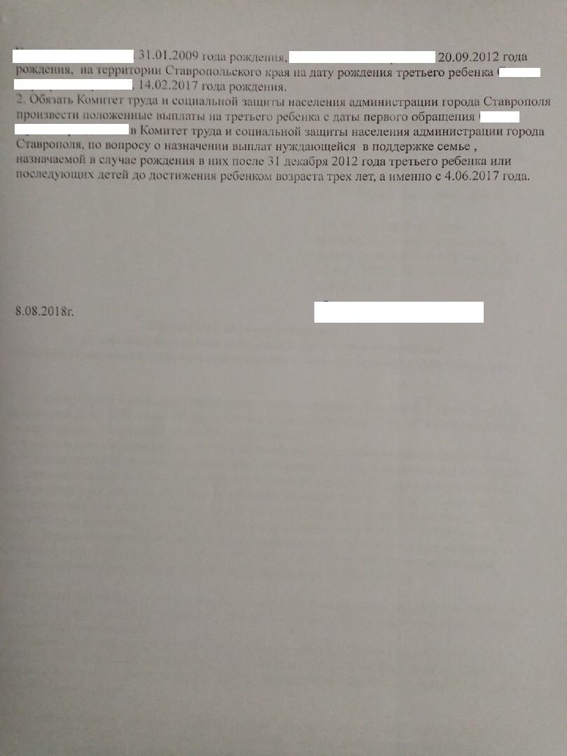 Состоялась кропотливая работа по сбору документом подтверждающих проживание моей доверительницы и ее семьи на территории Ставропольского края. И у нас это получилось. По представленным документам суд вынес постановление в нашу пользу. Представитель комитета на последнем судебном заседании молчал, по тому, что знал, что ему не чего противопоставить представленным доказательствам, а как все у него хорошо начиналось, грубые реплики, смелые высказывания, мне на секунду захотелось вернуться в тот процесс.