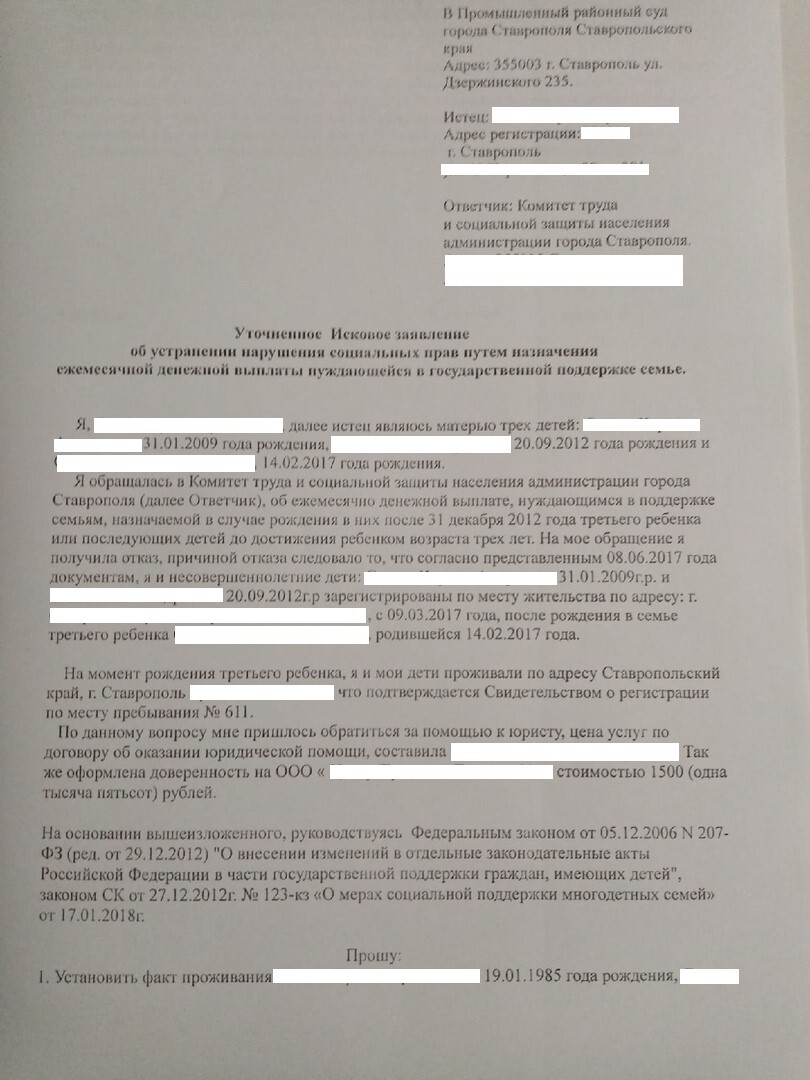 Клиентка хотела пройти судебные тяготы в одиночку, так как финансово не располагала на юридическую помощь, но ее Исковое заявление не принимали. Мною было подготовлено Уточненное Исковое Заявление, простенький, но броский Иск (фото прилагаю) и началась судебная битва...