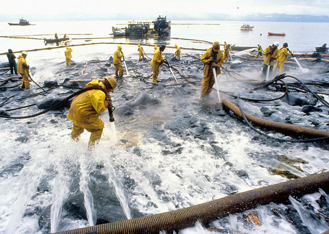 Чистка побережья после крушения танкера «Эксон Вальдез». Площадь нефтяного пятна составила 28 тысяч квадратных километров.