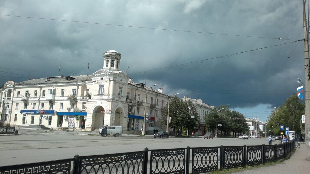 Это отрывок из текста романа Михаила Булгакова "Мастер и Маргарита". А на фотографии - часть улицы Нижнего Тагила с красивым названием Липовый Тракт. Засада, то есть туча, подкралась незаметно и через полчаса пойдёт дождь с градом, градинки были величиной с вишню.