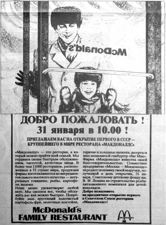 Первый в СССР и России ресторан быстрого питания "Макдональдс" открылся в Москве на Пушкинской площади 31 января 1990 года. Появление нового заведения, которое резко выделялось на фоне традиционного советского общепита, стало настоящей сенсацией для москвичей и самого "Макдональдса": в утро перед открытием ресторана выстроилась очередь свыше 5000 человек.