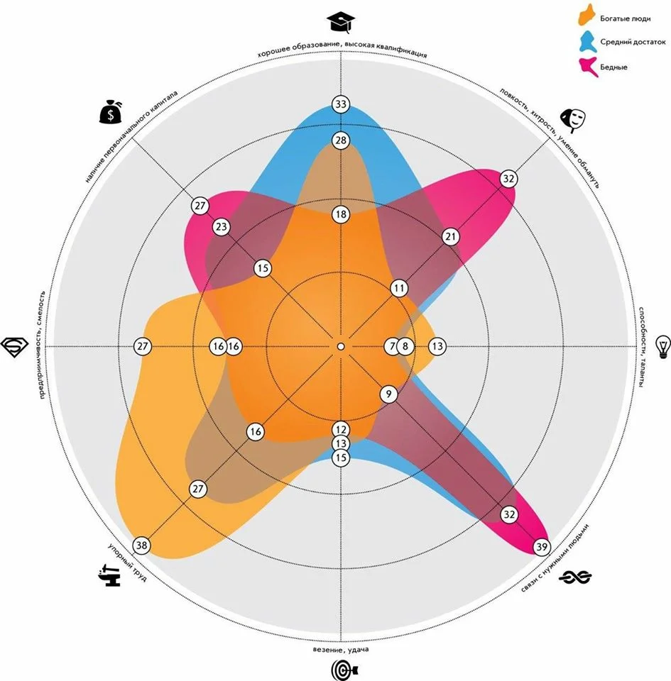 Посмотрите на это занятный график. Представителям разных социальных слоев задавали один и тот же вопрос: "В чем причина финансовой успешности человека?". Розовый цвет - бедные люди, золотой цвет - богатые, голубой - средний достаток. Как вы видите розовые щупальца указывают на то, что своим успехом люди обязаны: умению обмануть, связям с нужными людьми и начальному капиталу (папенька помог). Это и есть типичная нищебродская позиция.