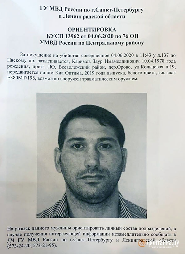 Как стало известно «Фонтанке», к утру 5 июня в полицейские подразделения разослали ориентировку с паспортной фотографией Каримова и текстовым описанием принадлежащего ему автомобиля.