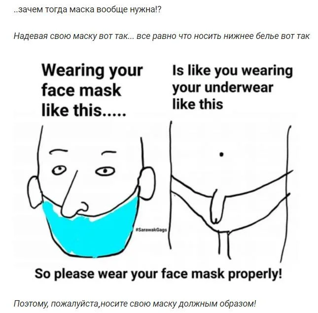 По личному наблюдению около 90% граждан носят маски примерно так, как указано на картинке ниже, защищаясь скорее от штрафа, чем от инфекции.