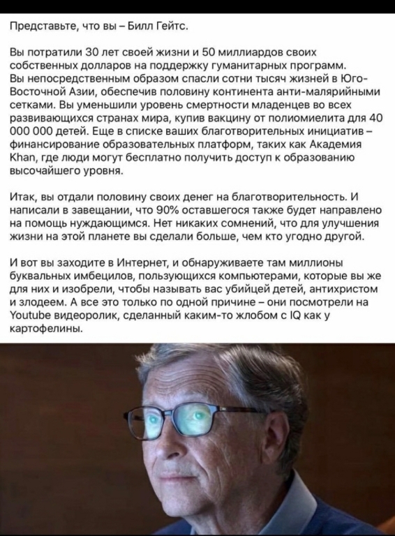 У меня только два вопроса к Гейтсу. Первый - что он скажет по поводу тех 67000 детей, которые скончались в Индии после вакцинирования его "подарком", после чего Минздрав Индии прекратил эту процедуру.