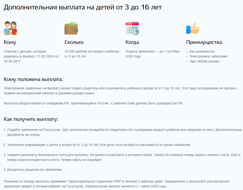 Пенсионный фонд продолжает перечисление денежных средств на ежемесячную выплату в размере 5 000 рублей на детей до 3-х лет и единовременную выплату в размере 10 000 рублей на детей от 3-х до 16-ти лет.