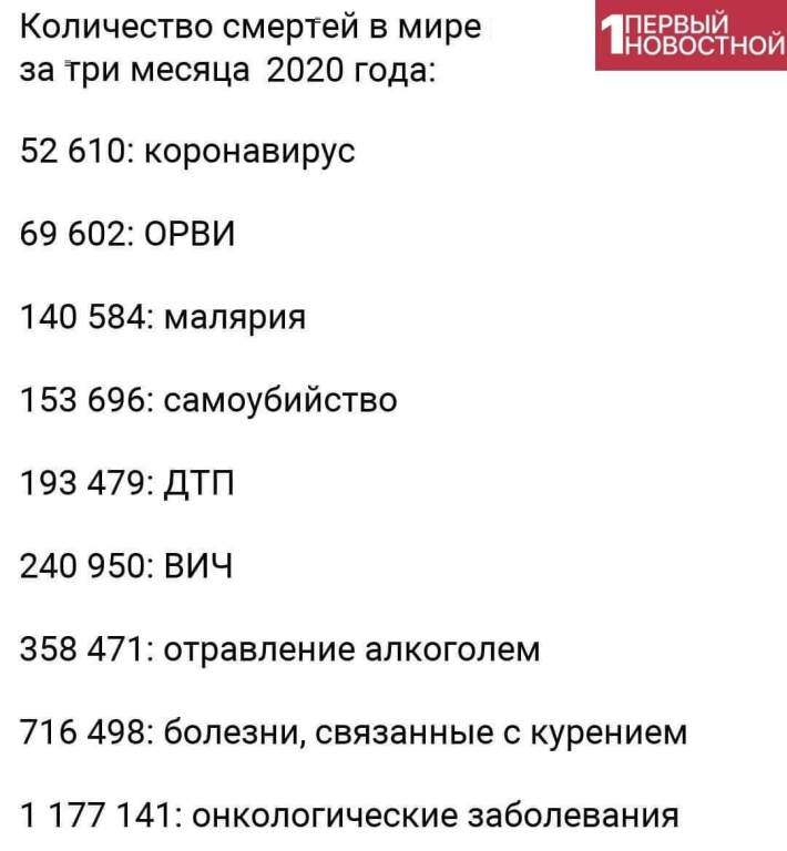 Более смешной чуши я не читал. И прекрасно знаком с медициной и ее статистикой. Самое смешное это ОРВИ и малярия. От ОРВИ не умирают. Это простудное заболевание. В РФ это единицы, а конкретно первые месяцы вообще ноль! И мешать в одну кучу ДТП, самоубийство, и примерно в 300 раз завышенное число смертей от онкологии это вообще блажь. А смешивать статистику по инфекционным заболеваниям и смерть от несчастного случая... не профессионально. Так что смешите и пугайте этой «статистикой» взятой с потолка детишек в дестком садике.