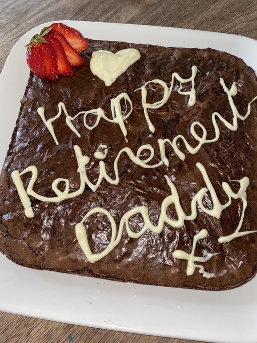 «Счастливого ухода на пенсию, папочка», — написано на праздничном торте бойца с шоколадом и клубникой.