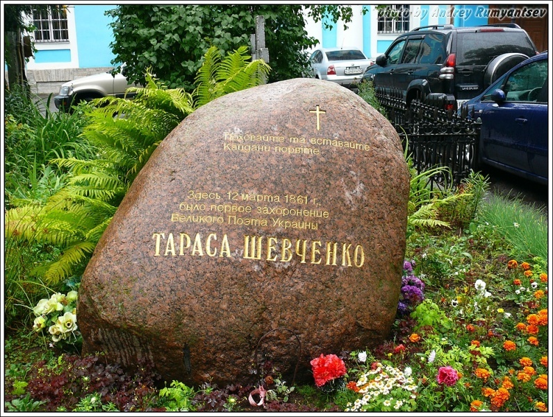 А дальше, когда идёшь к Храму Смоленской Божией матери, там стоит памятный камень на бывшей могиле Тараса Шевченко. Не святой. Но дух захватывает. А вот сам Храм в тот приезд был закрыт на реставрацию.
