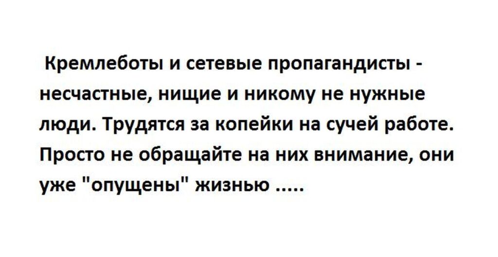 Бедненькая, соловьем поешь, вернее канарейкой по госдеповским нотам. А работать придется, нечего растить рантье, мажоров и голубков. Пожалуйся Ходору, он вербует таких буйно обиженных и лишенных девичества...