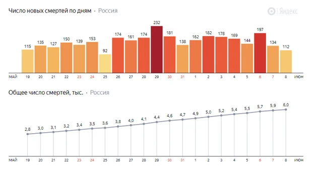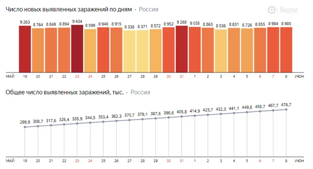 Правда, нельзя сказать, что в России ситуация вдруг резко улучшилась. В целом, число заражений не снижается, хотя и держится на одном уровне. Но все равно это около 9 тысяч человек каждый день. Да и число смертей не уменьшается, каждый день умирает не меньше 100 человек.