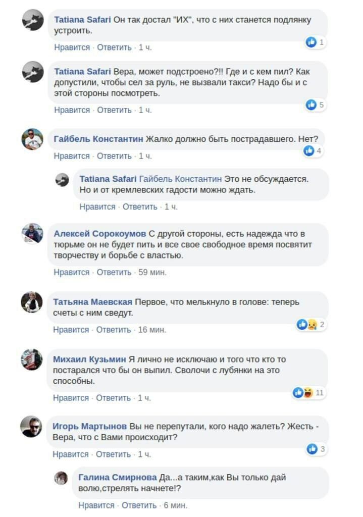 В сети уже соревнуются с прогнозами на уголовное дело и по этому случаю: "Посидит год-два и выйдет по УДО", "Ща неполживый борец с коррупционной теранией сунет кому надо денех и получит условку. (максимум посидит в вип-хате месяц-другой играя в футбол, ой т.е. в театре и выйдет по амнистии). А люди со светлыми лицами в своих уютных фейсбуках расскажут нам страшную правду, что это была спецоперация КГБ против борца с режимом. И снотворное ему вообще секретно и незаметно подлил секретный и незаметный чекист."