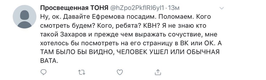 Если так ОЛьга Васильевна, приношу извинения. Но благодушие оно не во благо. Закон должен работать для всех одинаково, добро определенно должно быть с кулаками. Нам наверное проще верить в привидение, а что еще остается? ТАк и получается слишком много зла стало, и оно чаще побеждает и без последствий. Можно еще сказать о высшем суде, но человеческие законы должны работать, пока мы живы. Два гроба в семье в один день, это двойная трагедия. Жаль людей. И если рассуждать вашими понятиями, чем жестче ответит ефремов в этой жизни, тем меньше к нему будет претензий в другой, да и детям меньше грехов по наследству перейдет, коль родители свое отработают.
