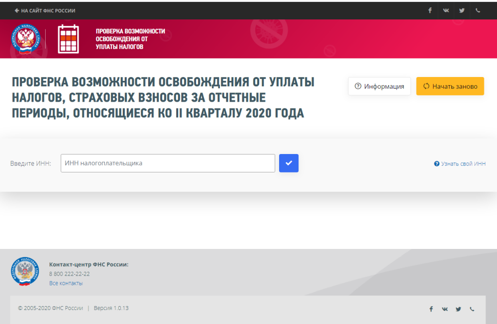 Федеральная налоговая служба (ФНС) России запустила сервис по проверке критериев освобождения от налогов во втором квартале 2020 года. На странице сервиса достаточно ввести ИНН организации или индивидуального предпринимателя, после чего сервис выведет информацию о возможности применения пониженных тарифов страховых взносов по ставке 0%, а также о платежах за отчетные периоды второго квартала 2020 года, от которых освобождается налогоплательщик.
