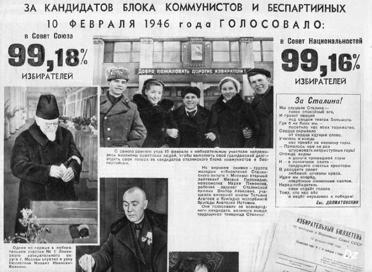 В СССР тоже были выборы. Первое голосование, в котором участвовало население страны в более менее полном составе, состоялось в 1937 году – тогда был выбран Верховный совет СССР. Нарушений при голосовании тогда не было, вбросов, фальсификаций голосов, как и шумной предвыборной кампании тоже не наблюдалось.