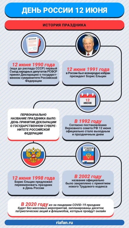 С 1992 года 12 июня официально стало выходным и праздничным днем. Сначала праздник носил название День принятия Декларации о государственном суверенитете Российской Федерации.