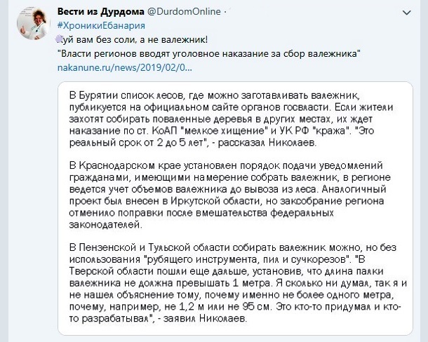 "Всем известно, что законодатель разрешил с 1 января 2019 года бесплатно собирать в лесах валежник для собственных нужд."